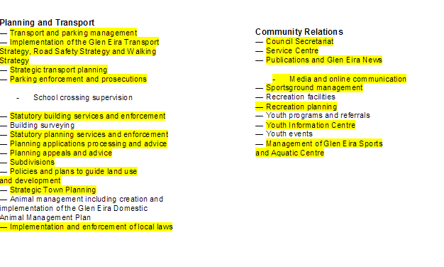 It appears to be saying that Glen Eira’s equivalent of 1984’s Ministry of Truth is twice as important as Planning and Transport. It is certainly responsible for any necessary falsification of historical events, and creates/manufactures “truth” in the Newspeak sense of the word.