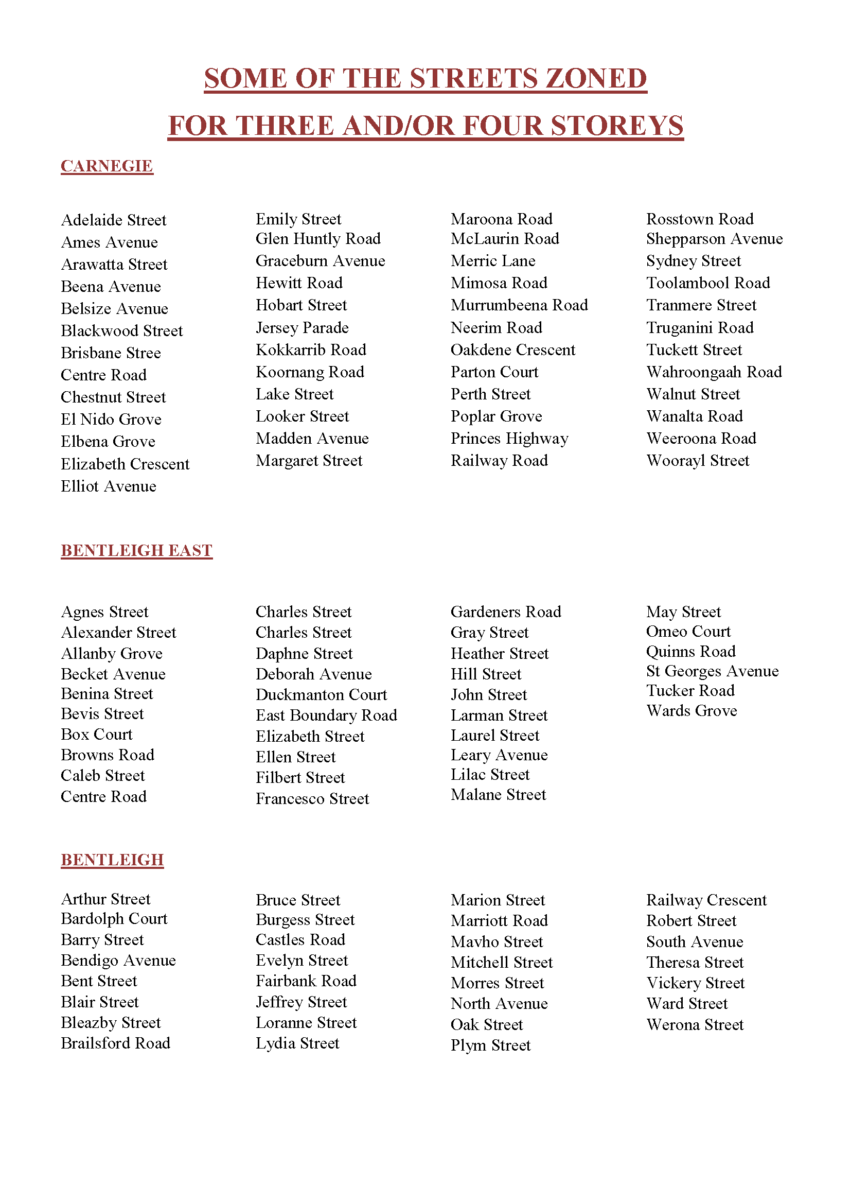 This is a ‘public service announcement’! We are pretty confident that most residents would not have the foggiest as to the zoning of their area – unless they have already been impacted. Much credit for this must go to council in that its maps are illegible and not all streets named. Hence, we thought it worthwhile to pinpoint some of the streets that have now pretty much been given carte blanche for three and four storey developments. If anyone has any doubt that this is the case, then there’s this summation from a VCAT member recently – The two schedules to the zones (GRZ) have similar provisions. Both provide for a building height up to 10.5m and include reference to a lift overrun. This would appear to indicate that apartment style buildings might be acceptable in these areas. (Malina vs Glen Eira – 7th October 2015)