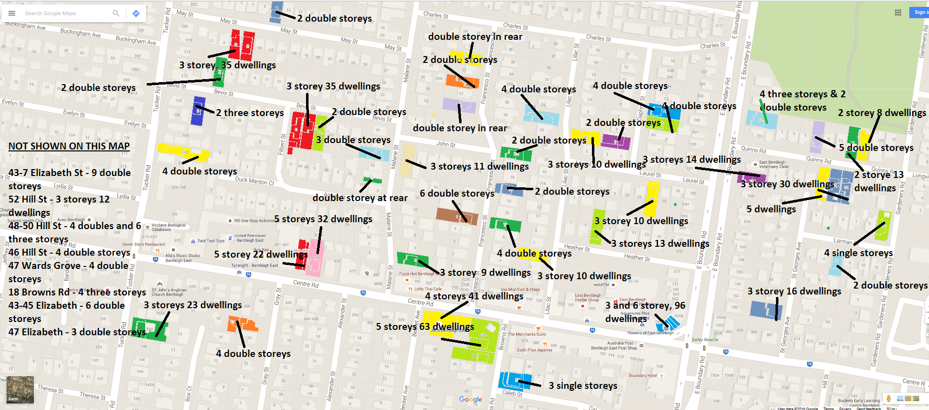 Thanks for this, but difficult to fit everything in on one map. We did focus on Centre Road a little while back and are confident that there have been plenty of further applications come in. See: https://gleneira.wordpress.com/2015/11/15/east-bentleigh-going-quickly/