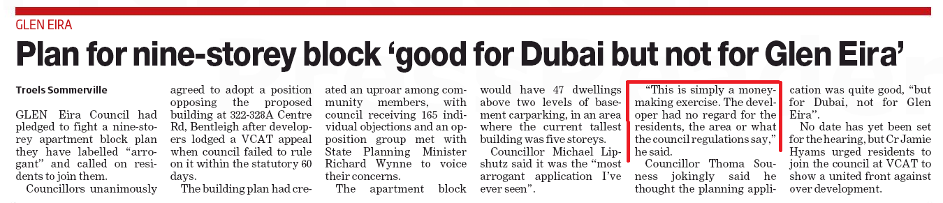 Just read the Caulfield Leader of this week. On page 5 Lipshutz has stated in Council that the application for nine-storey on 322-328A Centre Road “This is simply a money making exercise.