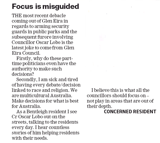 And as for Cr. Lobbo’s esteem I just do not know how he can put up with the treatment metered out to him in the council chamber. The spirit in the air seems to be that you can be heard if you agree with the powers in the council. I do not agree with all Cr. Lobbo’s views, however, I am prepared to accept that he has lived in more countries than most of us and he is perhaps more informed than several of the councillors who pretend to be interested in 100% of the community, unlike other councillors who never return telephone calls or emails … he always contacts residents later if not available at the time. There was another councillor who was completely silenced althougn also a very experienced caring person residents in his ward were effectively unrepresented.