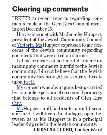 I just wonder if the Jewish Council is also talking to Cr. Hyams and Lipshutz. I attended the said Council Meeting and was shocked to hear both these Crs. take Lobo’s perfectly reasonable and widely accepted comment of “any group that requests approval for guns makes a target of themselves” into an anti-Semitic tirade. By doing so, Hyams and Lipshutz did more to engender anti-semitism than Lobo.