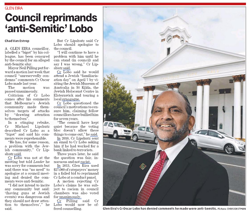 Jesus Christ. Enough bull. How about we call a spade a spade? Lobo is a dunderhead, a naive fool and plenty of other things. Heart might be in the right place but he’s got no idea of how to go about it. He is not a political animal like some. He blurts stuff out that is embarrassing to the ruling classes because it shows up their wheeling and dealing behind closed doors. That’s unforgiveable. Now whether or not he is an antisemite or a racist I’ve got no idea. What is not in doubt he hates Hyams and Lipshutz. They happen to be jews. Does that make him an antisemite? I’d guess they hate him too. Are they racist? Several folks have told me that every time Lobo gets up to speak these guys smirk, roll their eyes, and gesture across the chamber. Unseemly behaviour but not picked up by our fabulous recent mayors in Magee and Pilling. I’d call that conduct unbecoming. Personally, I am inclined to believe Lobo when he tells the Leader that he’s been bullied. Council is an expert in that.