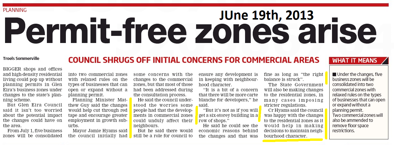 Council “had some concerns” but didn’t share them. We have only Jamie’s word that their concerns were addressed. Since Council has argued that unless something is prohibited, it is appropriate, Council has endorsed VCAT’s recent decisions and undermined its own position. Until such time as Council has detailed structure plans and specified building envelopes for each zone and precinct, VCAT can continue to do as it does—order permits be granted for anything that isn’t prohibited.
