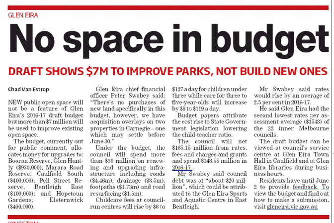 The lack of public open space in Glen Eira has been known for decades. It was acknowledged in 1987, again in the open space strategy of the nineties and once more in 2013. Residents were lead to believe in the 1996 strategy that 50% of revenue raised would be used to purchase NEW open space. In 2013/14 ratepayers were promised even more (via council resolutions) – ie that all monies raised from the levy would be put towards the purchase of NEW open space and not used for ‘development’ of existing open space. Thus twice residents have been dudded and promises literally thrown out the window.