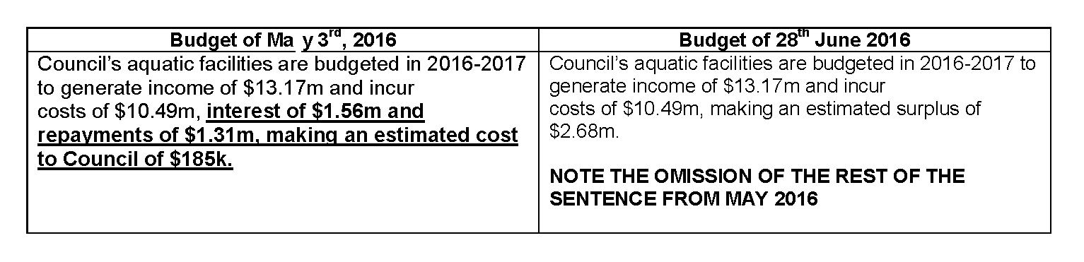 Finally, here are some other comparisons from the May and the June documents. The onus is firmly on this council to explain these ‘discrepancies’ in plain English and to account for every single dollar that is to be spent. We also remind readers that the new ‘negotiated’ interest rate for GESAC has not been revealed when the previous interest rate was NOT deemed top secret! Why the difference? And why aren’t residents privy to what is happening to their hard earned cash? We also note that the claim that GESAC is paying for itself is no longer included!