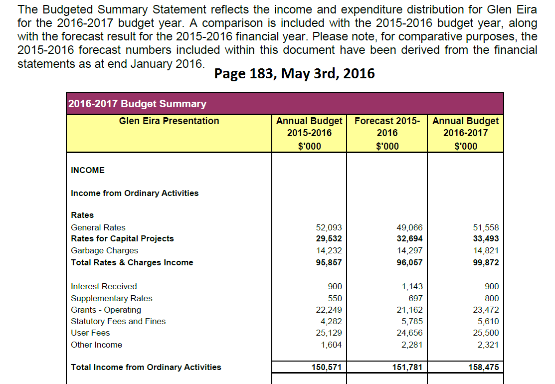 One of the most bewildering announcements from the two budgets are the figures for the income derived from ‘general rates’. Both budgets claim that the numbers were compiled from the ‘financial statements as at the end of January 2016’. Thus they should be identical – especially since they are ‘forecasts for 2015/16’ and not for 2016/17. Yet the discrepancy is staggering – a $5 million difference for figures that are supposedly based on the identical financial statements. In short, ‘forecasts’ for the past year should not change – but in Glen Eira they do!