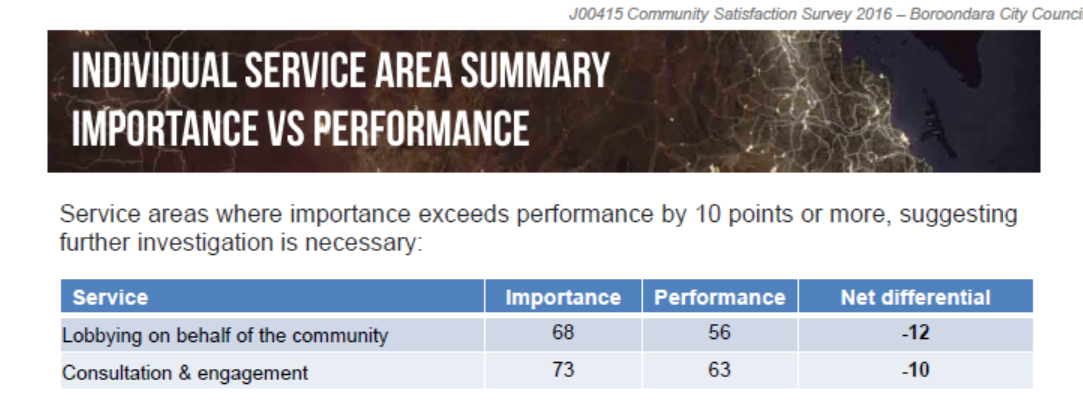 The most significant aspect of this survey which the Leader article does not focus on, is the discrepancy between resident evaluation of the importance of a service and the perceived ‘results’. Differentials of well over 20 signal a new low point in Glen Eira. For example: residents believe that ‘consultation’ is vital, giving it a ‘rating’ of 75 for ‘importance’. Their judgement on performance is 51! What should also be highlighted is that the differential between importance and performance has been growing steadily over the past few years – yet council has failed to address this decline. No amount of spin can disguise this fact!