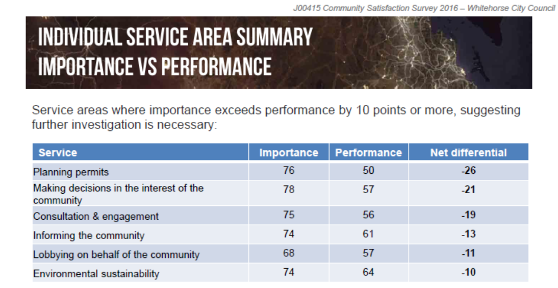 PPS – Not all councils have thus far published the results of their surveys. However, we’ve taken the opportunity to highlight some of these results as a further comparison with Glen Eira. For starters, Stonnington and Greater Dandenong DID NOT HAVE ANY SERVICES WITH A GREATER DIFFERENTIAL OF 10 POINTS. The screen dumps (below) from Whitehorse and Boroondara reveal that their residents’ angst is nowhere near those from Glen Eira’s population and the number of services with a discrepancy of 10 or more points is also well below the number to be found in Glen Eira.