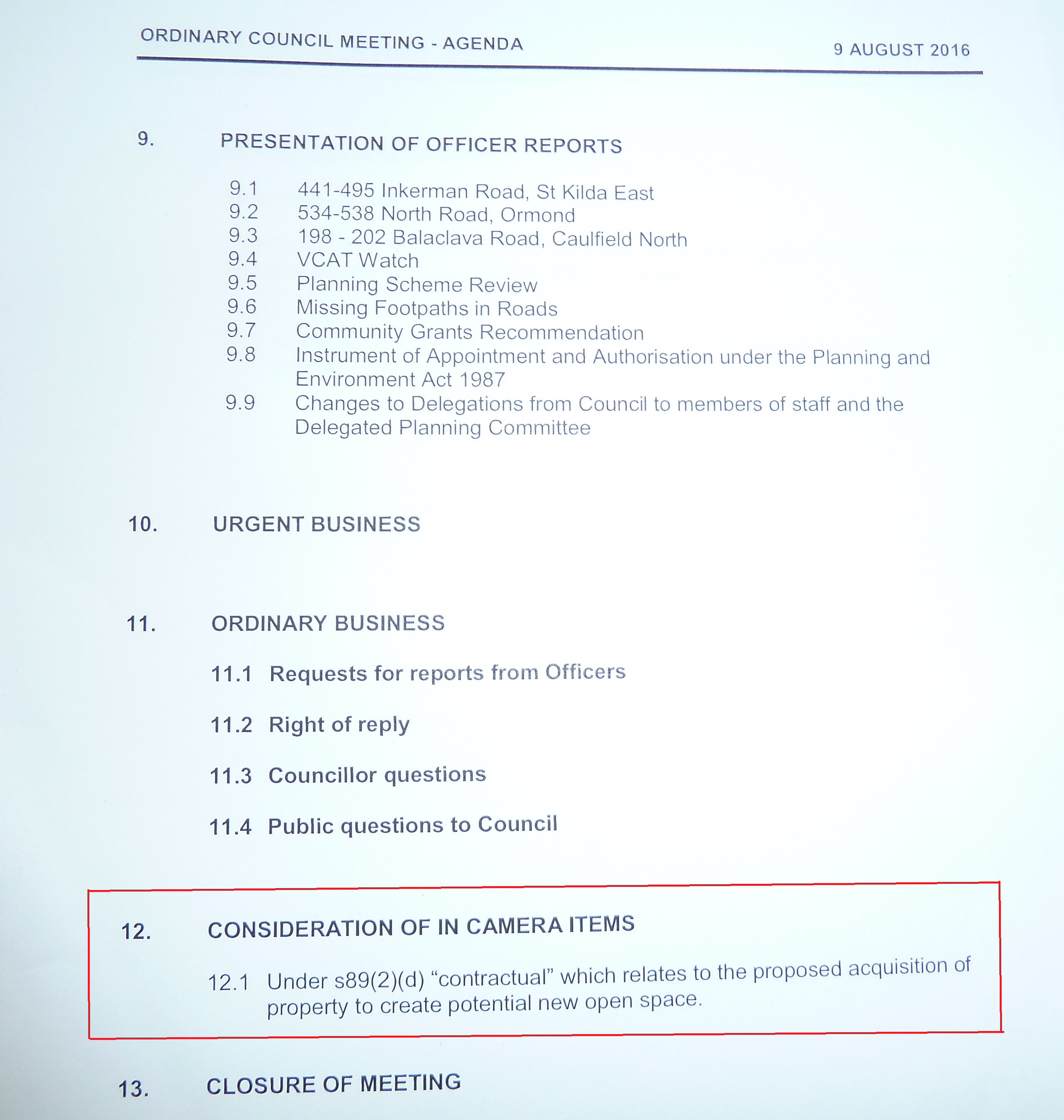 Residents have no idea as to the ‘report’ much less any idea as to what this resolution concerns, or what its ramifications are? Will council be spending money for open space? If so, how much? Did the report recommend no purchase? Where is this potential open space? Is the location good value? We can only assume that if the wording of the item was changed then it is a deliberate attempt to conceal from the public what is really going on! What makes this even easier to conceal is that council sees fit to provide only half a dozen or so agendas in the chamber when the gallery over the past few meetings has at times contained 10 times this number of residents. Please remember that council has ‘promised’ several times over the years to consider displaying motions, amendments via some form of overhead, so that residents can follow what is going on. Nothing has eventuated!