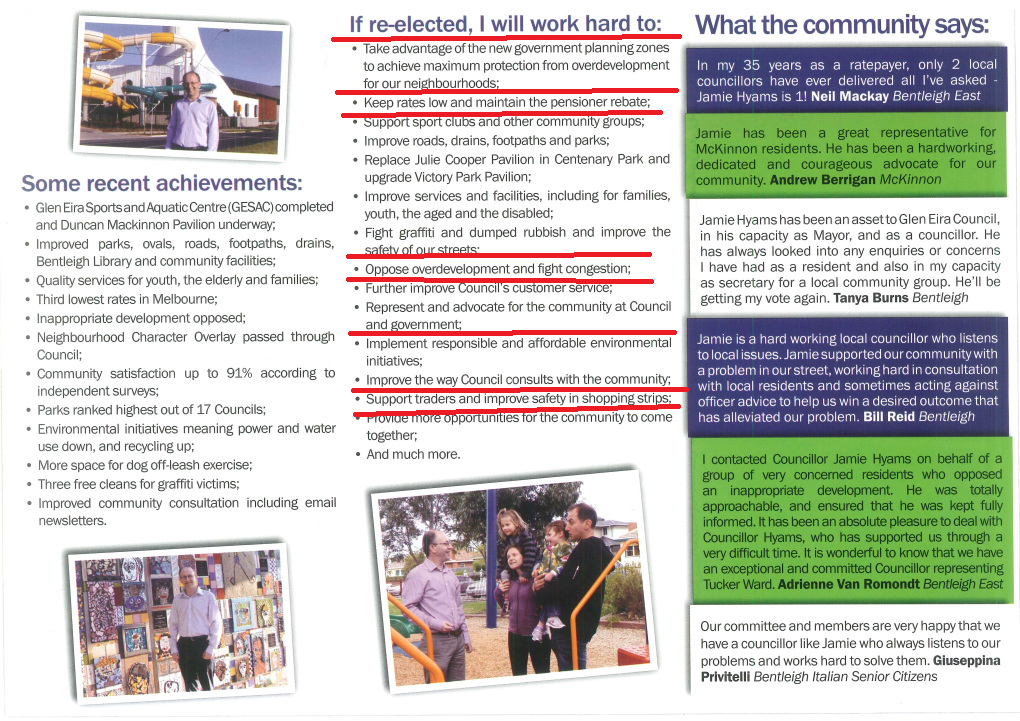 In one fell swoop, less than one year after making these 2012 election utterances on over development, zones and community consultation Jamie did a major dump on these promises by implementing the zones in 2013 and still continues to dump on them.