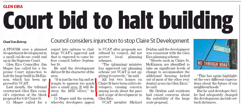 - Several things to note in the above: (1) the VCAT member does NOT STATE that council ‘encourages dwellings of this scale’. What he does say is that council policy and the zoning makes Claire Street an ‘ideal’ location for 3 storey developments. (2) as for council not ‘encouraging’ ‘development of any scale’, perhaps Magee should have a read of the planning scheme he is supposed to administer!