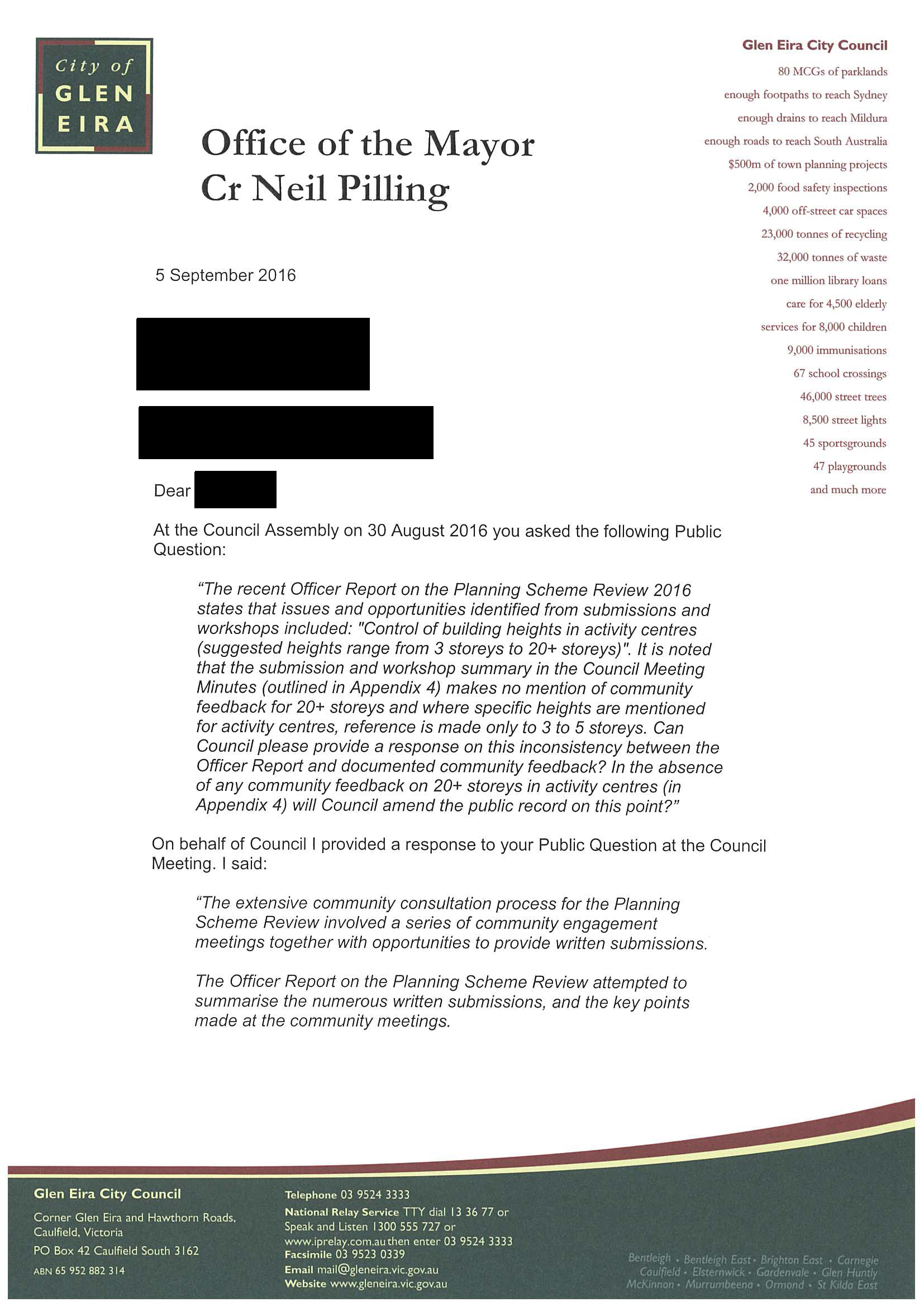The response indicates why Council does not want to include Public Questions into Council meetings. What a load of rubbish to document that 20 storeys were suggested by anyone in the community. What about some balance for the public record e.g. 10,000 community members requested up to four storeys in activity centres and one developer ordered 20 storeys.