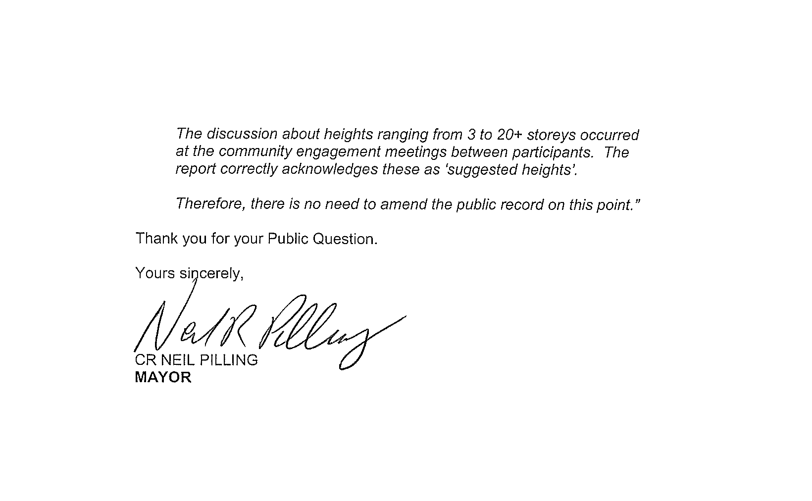 Bit of nit picking here. If the person wasn’t at the council meeting then Pilling is dead wrong. He did not “provide a response to your public question at the council meeting”.