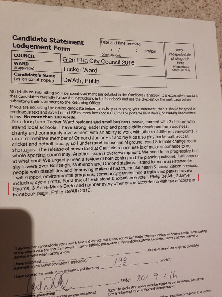 This time around we have a far more serious potential breach. Candidates are not permitted to include their how-to-vote preferences in the election packs that will go out to residents. They are required to provide a 200 word pitch about themselves. Below is De’Ath’s effort. It clearly indicates preferences and whom to vote for. In our opinion this is a breach of the legislation.