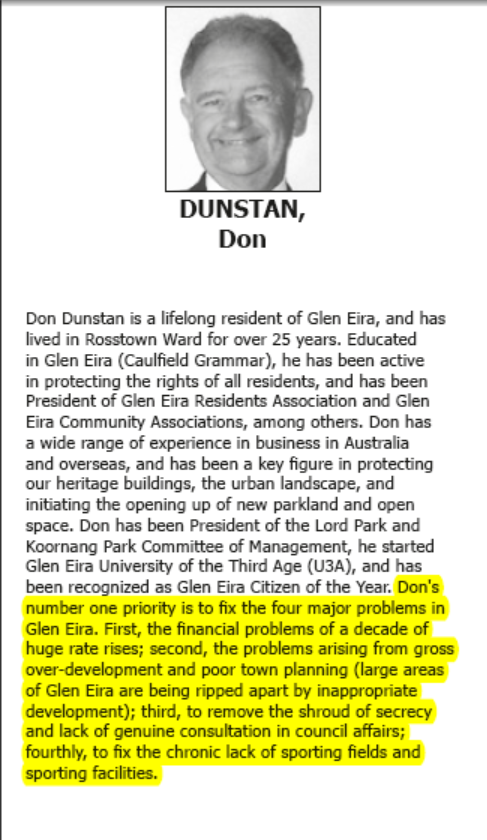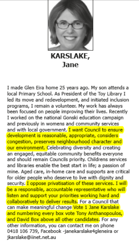 What irks us most is the cry to ‘keep rates low’ – especially from incumbents across the board. The truth is that Glen Eira for the past decade has had one of the highest annual rate increases in the state – 6.5% apart from one year when conscience got the better of them and they voted in an increase of slightly less. Were it not for the current rate capping, then the original proposal was that the 2016/17 budget would also include a 6.5% rate increase. Then of course, we need to consider the financial management and oversight provided by these incumbents. Council is now back up to the huge debt of $24 million, yet still splurges on mega palaces and still cannot bring in projects under budget and on time.