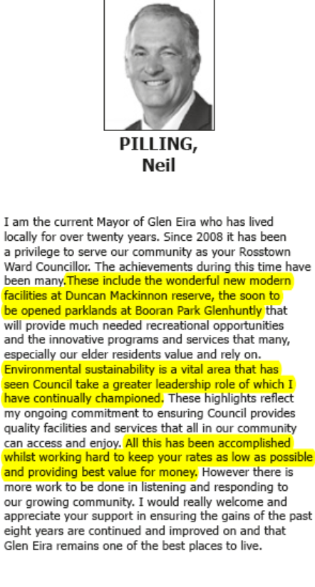 Pilling and the gang tried a last minute effort to overturn the Booran Rd Park, with a plan to hand it over to private soccer club, it failed when the rest of the councillor told them no-way,