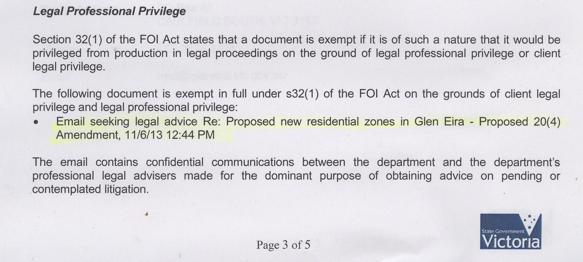 Add to this various public questions dating from July 2013 asking when council would begin its community consultations and we find responses that were blatantly untrue and designed to mislead and deceive. There was never any intention to alert the public or consult with them. We know this because as far back as 2009 Akehurst had written an officer’s report that said there would be no community consultation if the zones, as they were proposed in 2008 were ever to come in. We also know that Guy, the department honchos, Hyams, Newton and Akehurst had been busy meeting since at least April 2013 and spending taxpayers’ money on getting legal advice as to how best to thwart any potential legal challenges and, we assume, whether or not a formal resolution had to be tabled at council meetings. The intent was always to avoid public consultation and accountability. We, the residents, were irrelevant to the devious and secret collusion going on between Matthew Guy, the department and council.