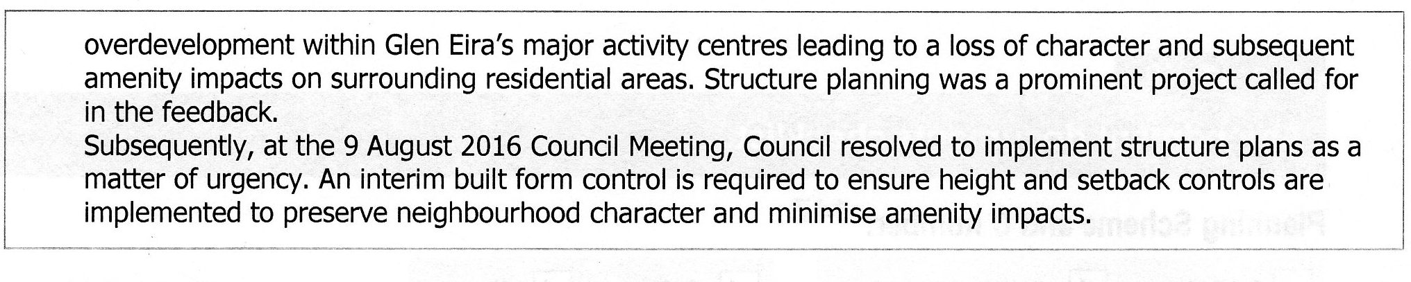 Even if we accept this position, it still leaves a multitude of questions that require honest answering. Structure plans are intended for use in activity centres. Elsternwick is a MAJOR activity centre – yet it has been excluded from the interim height controls recently proposed by council. The spurious and unbelievable excuse provided by councillors was that in the ‘popularity’ contest, Elsternwick featured lower on the list of priorities than did Bentleigh and Carnegie. This may well be true, but it is hardly a valid excuse for neglecting Elsternwick and the prospect of major high rise development that is on the cards with Coles, Ripponlea studios, etc. This leads us to suspect that Council has geared Elsternwick to accommodate much denser development in this area.