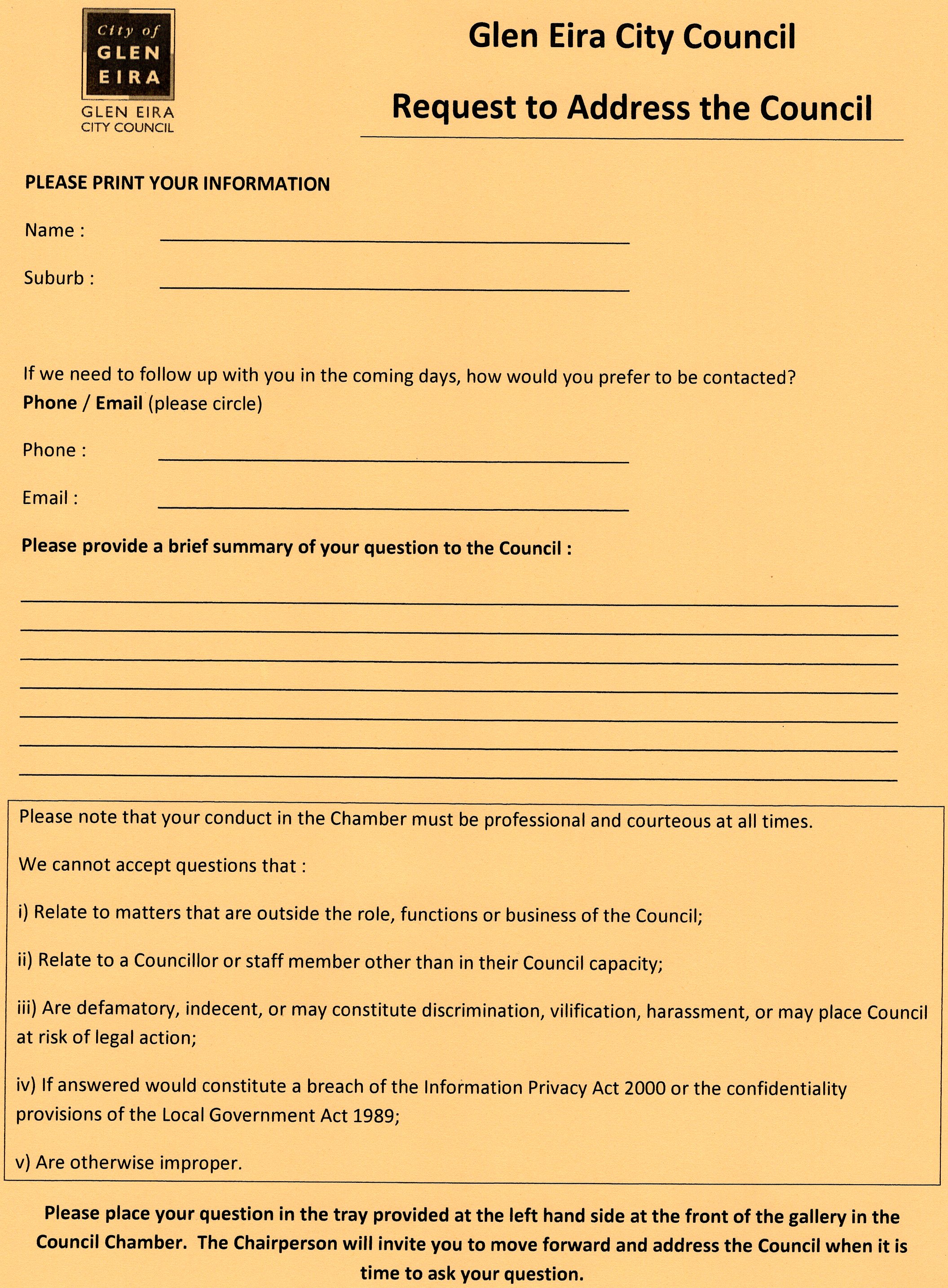 Delahunty began the meeting with some explanatory comments regarding the above sheet outlining ‘Request to Address the Council’.
