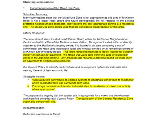 - Residents have objected on the basis that the land should be rezoned to GRZ in keeping with its proximity to surrounding residential properties. Whilst council admits that a GRZ rezoning ‘could also comply’, there is not one single sentence in the officer’s report which seeks to explain, much less justify, why this alternative zoning solution is not mentioned again or even considered. Given the real possibility that the ensuing planning application could include merely one shop or office, and 50 or so units, then we do not see that this will have any real impact on residential profits for the developer!