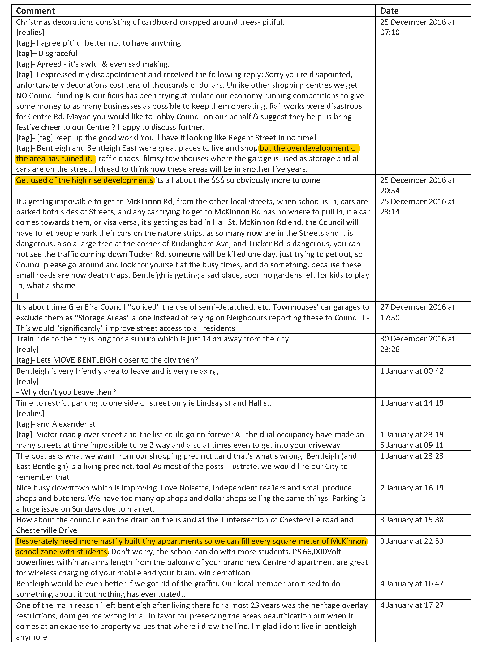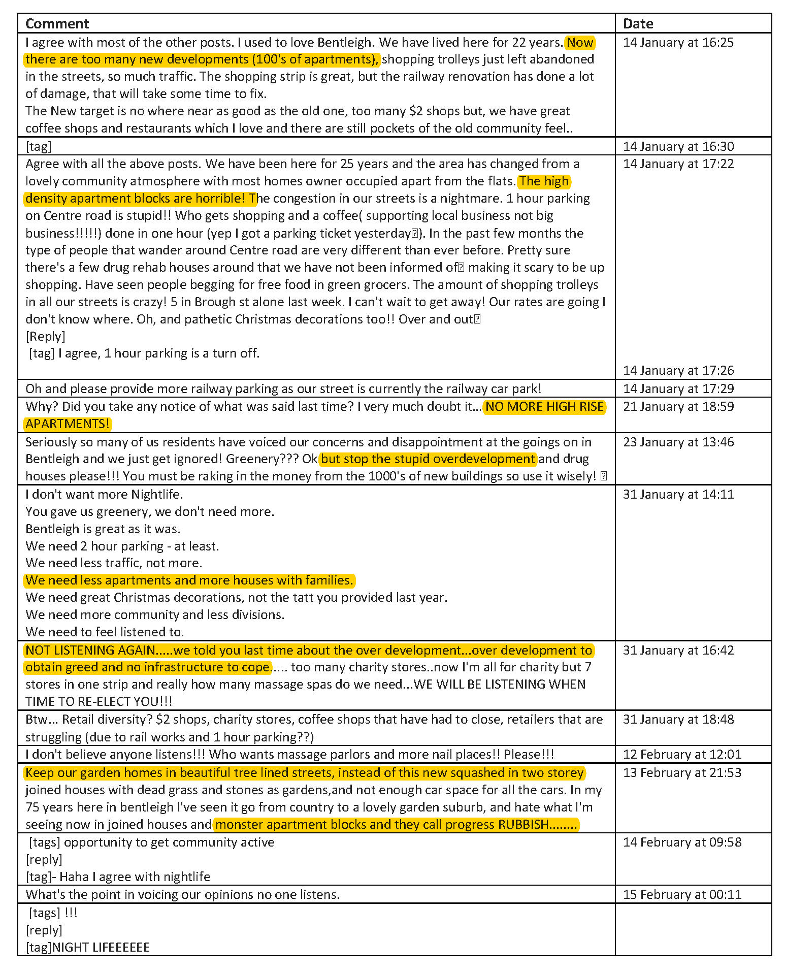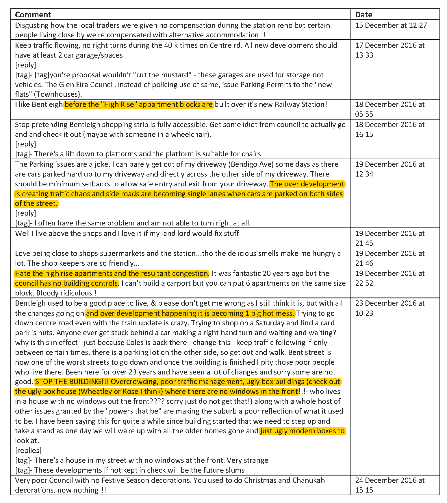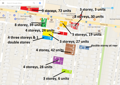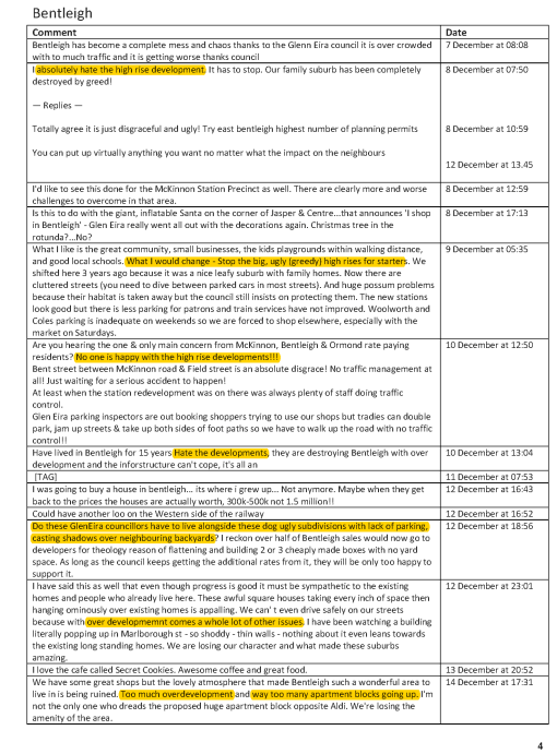 - The failure to acknowledge the countless comments that specifically referred to overdevelopment in the various side streets of Bentleigh – ie the damage done via the zones