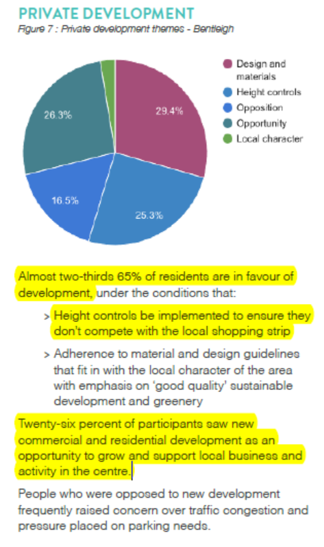 The image above comes from Council’s summary of community responses to the Bentleigh ‘shopping strip’ online survey. According to the ‘facts’ presented here we are meant to believe that 65% of respondents are in favour of ‘private development’ (whatever that means!) – but with some constraints on height and ‘character’. Please note that of the valid 248 comments included in the document, the claim that 65% are ‘supportive’ does indeed represent an entire work of fiction. What is most disappointing about this report is: