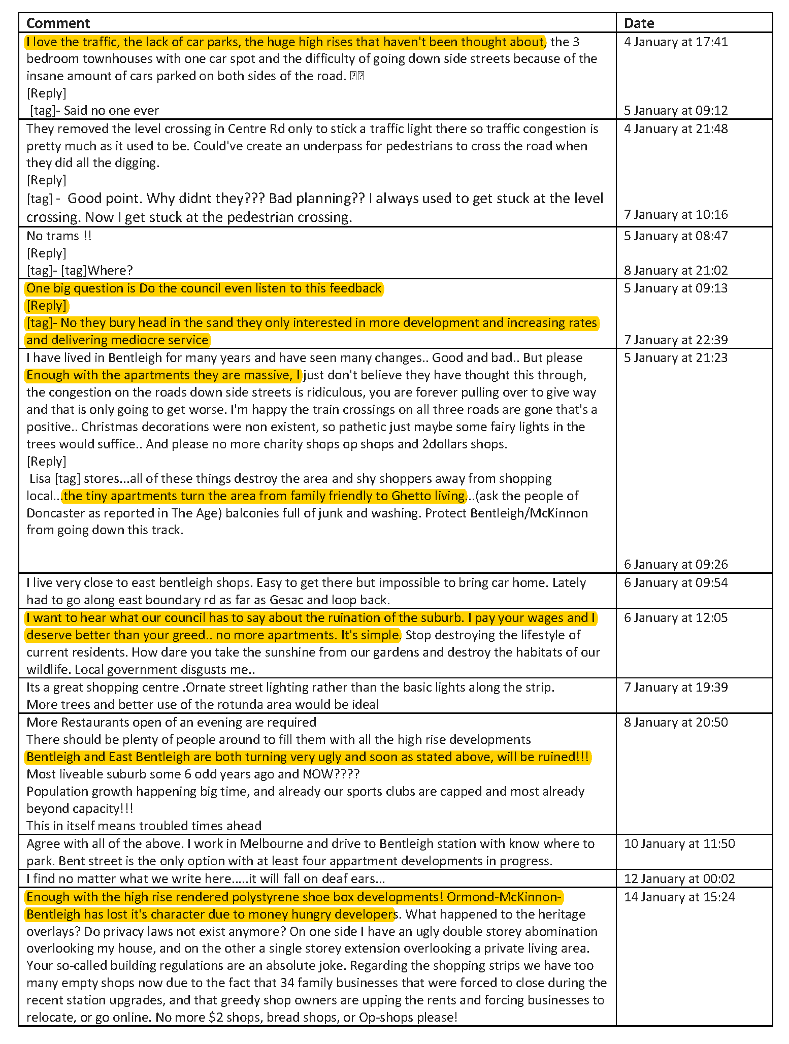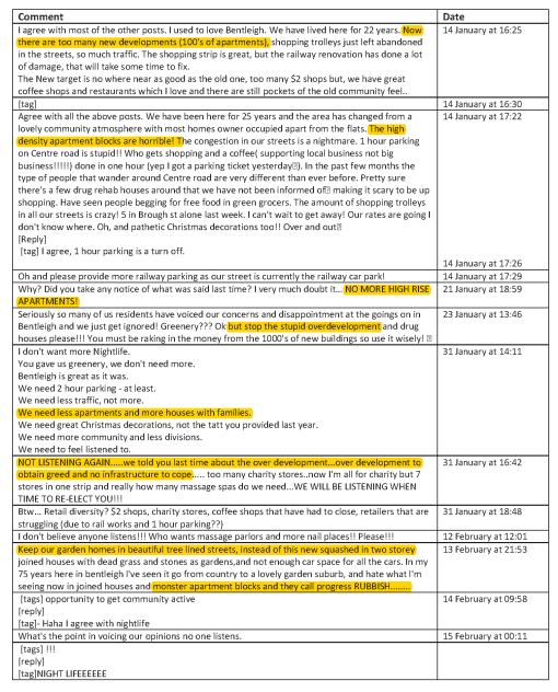 - The exclusive emphases on the ‘survey’ comments rather than the opinions expressed via the forum PLUS the apparent ‘editing’ of the forum comments themselves – ie not every comment made online is included in the resulting ‘summary’. Here is one example of what’s been omitted – The critical and major issue is the urgent implementation of height and appropriate building form controls. Interim measures are required immediately to ensure a planned future for the shopping precinct. The inappropriate and unplanned overdevelopment must be stopped now to ensure that structure planning results in long term plan