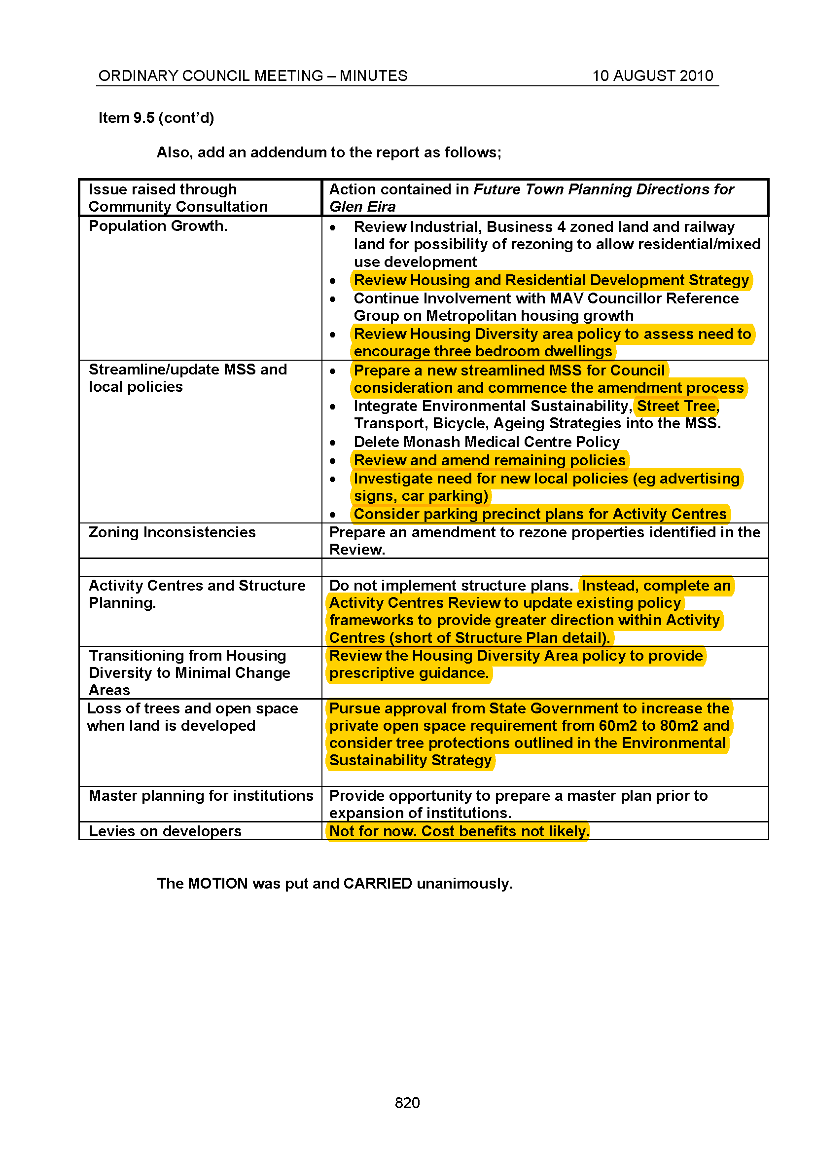 PS: just as a reminder of council’s failure to deliver on long made promises, we repeat part of a previous post that confirms everything the Auditor General claims. The image below comes from the minutes of 2010 and the (in)famous 2010 Planning Scheme Review. Please note all the promises that were made with none being delivered in the space of 7 years! Three councillors of that time are still on council – Esakoff, Hyams and Magee and Delahunty arrived in 2012. What have they done to ‘progress’ the initiatives of the review over this time span? The highlighted sections below speak for themselves.