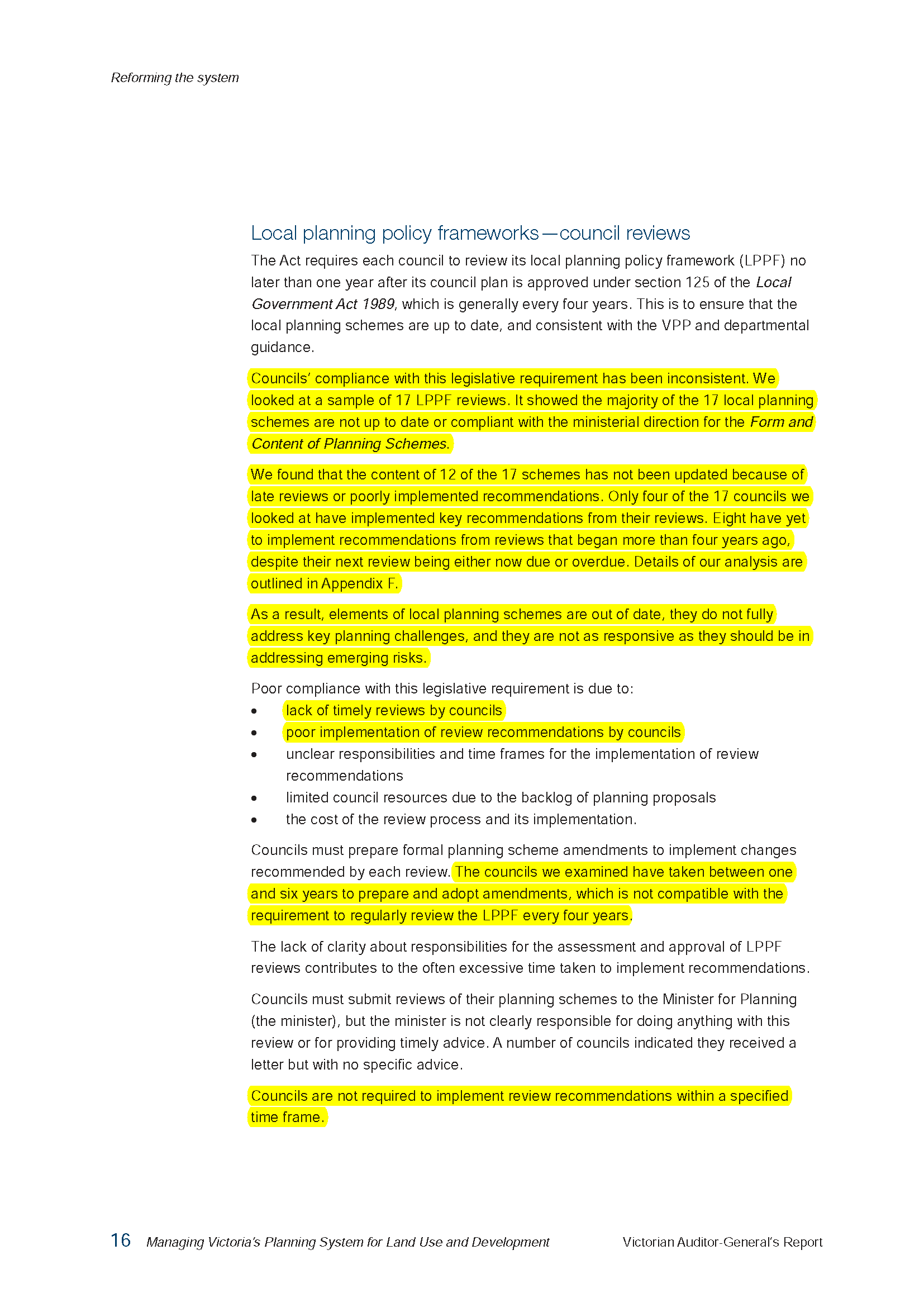Some councils are also slow to review and revise local planning schemes, and there is no requirement for DELWP to regularly review and revise the content of the VPP.