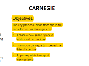 Below is what council sees as the road map for the next phase of ‘consultation’ for four of the designated activity centres – (the screen dumps come from the ‘Transformational Concepts’ report). Please keep in mind that no explanation has been given why Hughesdale and Murrumbeena should be included as part of the first cabs off the rank instead of say Ormond, McKinnon and even Balaclava, Glen Huntly and Caulfield which according to the latest version of Plan Melbourne are now designated as MAJOR ACTIVITY CENTRES!