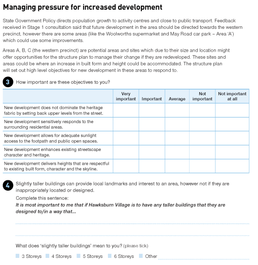 Residents were asked to sit at the various tables and a planning officer was assigned to each table. One person from each table was asked to take notes and report back to the entire gathering. More disconcerting was that each officer had a prepared list of specific questions to ask – ie how many people in your household? How many bedrooms? How many onsite car parking spots? Where would you like to live in 15 years? etc. Basic demographics which in our view are both meaningless (given the sample available) and secondly far more precise figures are available from various sources.