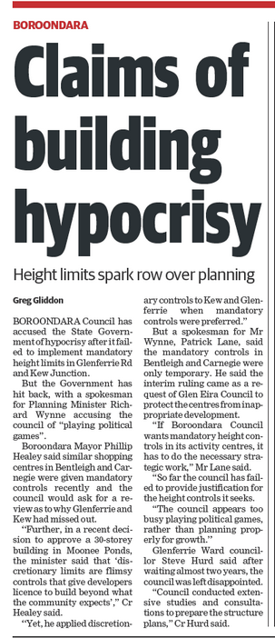 Worth noting that according to an FOI application, there was no strategic justification supplied by council for its request for the interim height controls in Bentleigh and Carnegie. Wheeling and dealing behind closed doors is NOT planning! Further, Boroondara was one council which came out strongly again Wynne’s Amendment C110 and the myth of protecting back yards. Interestingly, there has not been a whisper from Glen Eira on this latest amendment!!!!!! Surely when the prized NRZ is in danger, one should expect some comment from council? Or is silence the price that is paid?