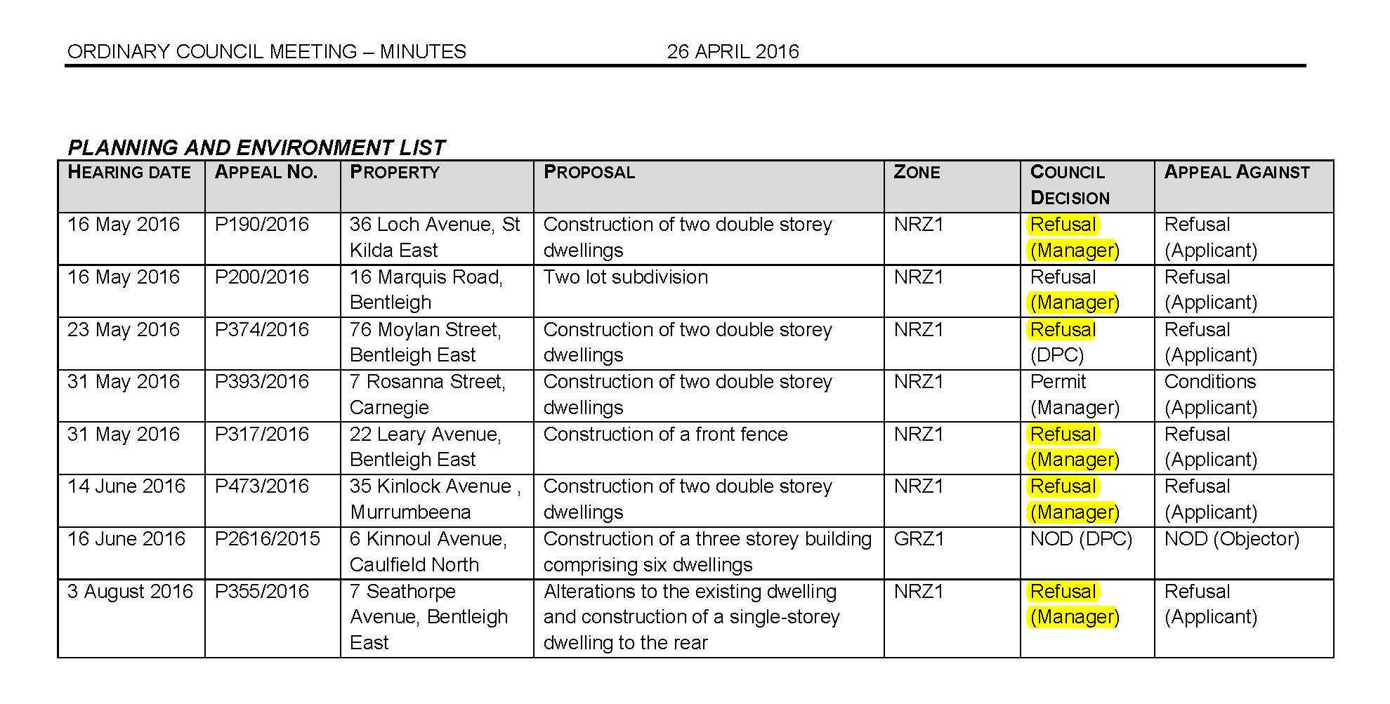 PS: in order to provide a little more context to the above we add the following – a list of all published VCAT outcomes from January 2016 to the present day. All decisions involved 2 double storey applications in the Neighbourhood Residential Zone. Council’s record as revealed below is literally appalling with only one ‘refusal’ upheld and only several ‘varied’ – ie council’s conditions chucked out. More applications are awaiting decision.