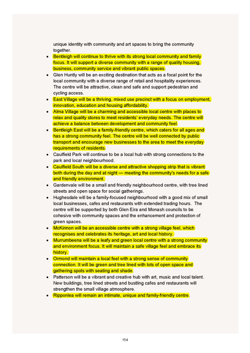 We acknowledge that Plan Melbourne has foisted some conditions onto council – ie Caulfield Junction as a Major Activity Centre, plus Moorabbin, etc. However, this does not excuse the production of a document that is full of meaningless waffle and motherhood statements, plus similar promises to what has been made and not been acted upon in the past 15 years! It is surely time that council comes clean and informs its residents in a straight forward and honest manner exactly what it proposes! We would also welcome a submission period of longer than the 3 weeks indicated.