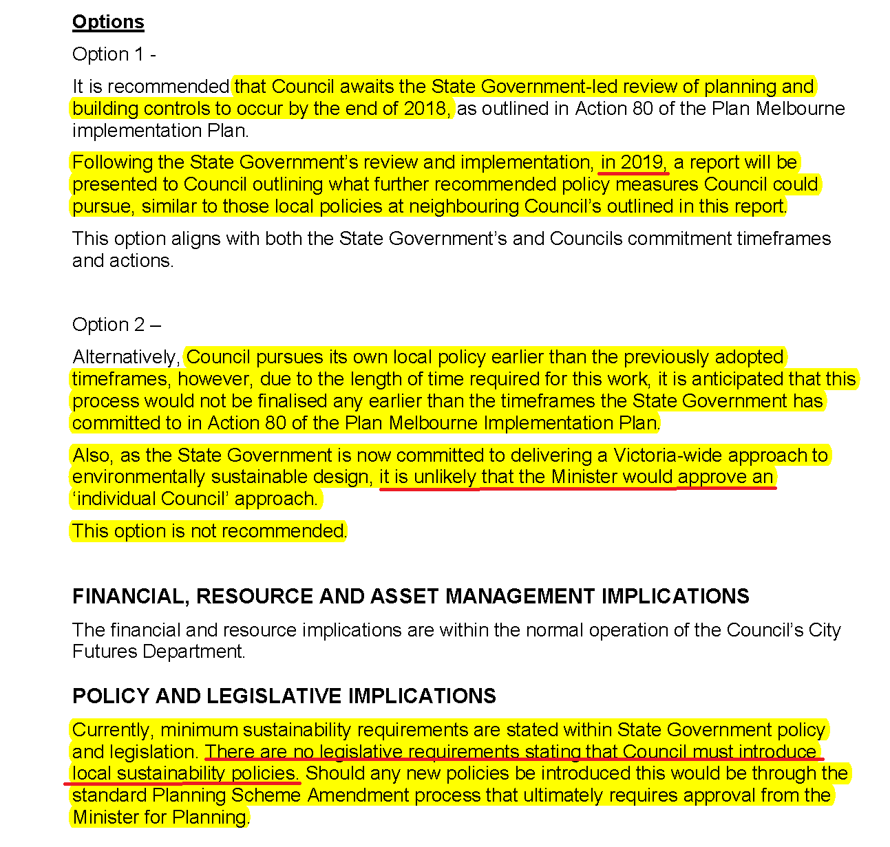 We must also point out the complete lack of ‘objectivity’ in the officer’s report. Six metropolitan councils have been successful in introducing their own Environmental Sustainability Design amendments. Admittedly, these expire at the end of December 2017 as noted in the report. What is not noted is: