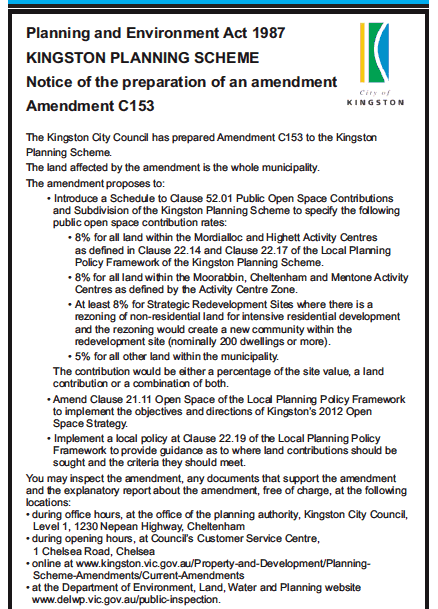 Whilst 5 new councillors were elected, it hasn’t taken long for them to be completely absorbed into the prevailing ‘do nothing’ , pro-development culture of this council. Opportunity after opportunity has arisen for real and dramatic change, as evidenced by the last two bullet points mentioned above. Residents should also not forget that any changes to the Local Law have also been delayed until 2019 when the current law expires. Nor should we forget the delay in introducing an amendment to hike up the open space levy. Council’s excuse? Let’s wait for the latest census data! Well it is obvious that other councils do not intend to wait and have been working away solidly to impose adequate costs on developers that actually mean something. Here’s what Kingston is doing. The image is from today’s Caulfield-Moorabbin Leader. Amazing how other councils can proceed and work for their community!