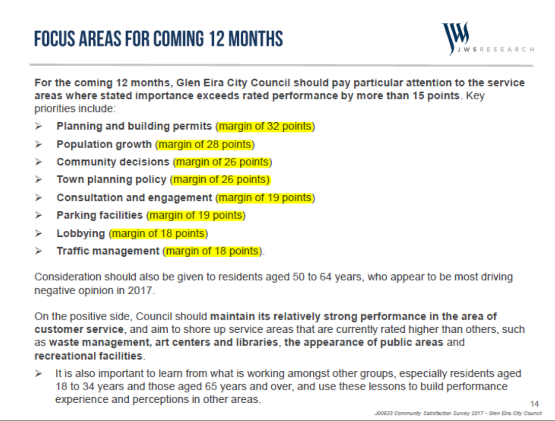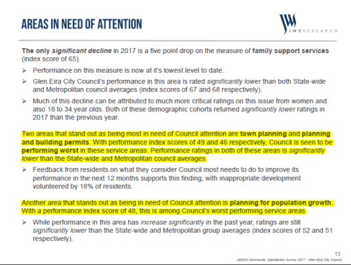 The most important indicator in our view is the differential score between ‘importance’ and ‘performance’. In other words, how important residents regard a particular aspect of council’s work compared to the actual performance of that work. Glen Eira has never had a differential of over 30 points as this year’s survey reveals. Year after year these areas have been highlighted by responses as basically failing resident expectations. That this is still the case, and worsening, says much about how council is addressing residents’ concerns.
