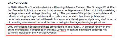 - Why must residents wait for at least another 2 years before there is the chance to include other properties such as the Dandenong Road one onto the Heritage listing in the Planning Scheme? Why can’t residents start nominating sites now? Why can’t the work begin now?