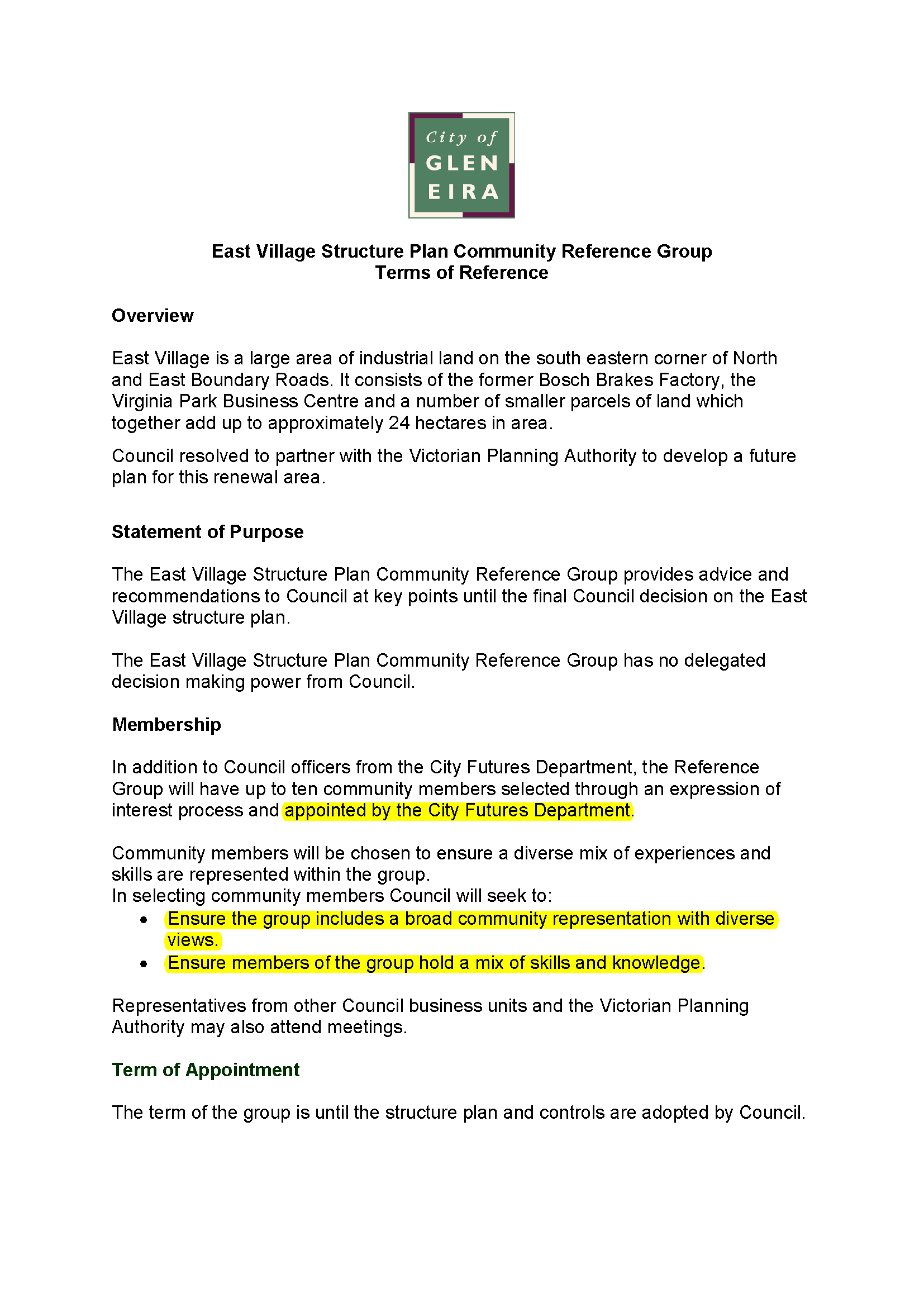 Council has published the Terms of Reference for its Community Advisory Group for the East Village project. Ostensibly, the creation of this advisory committee is a positive step, if somewhat belated in that the first draft of the resulting structure plan has already been set.
