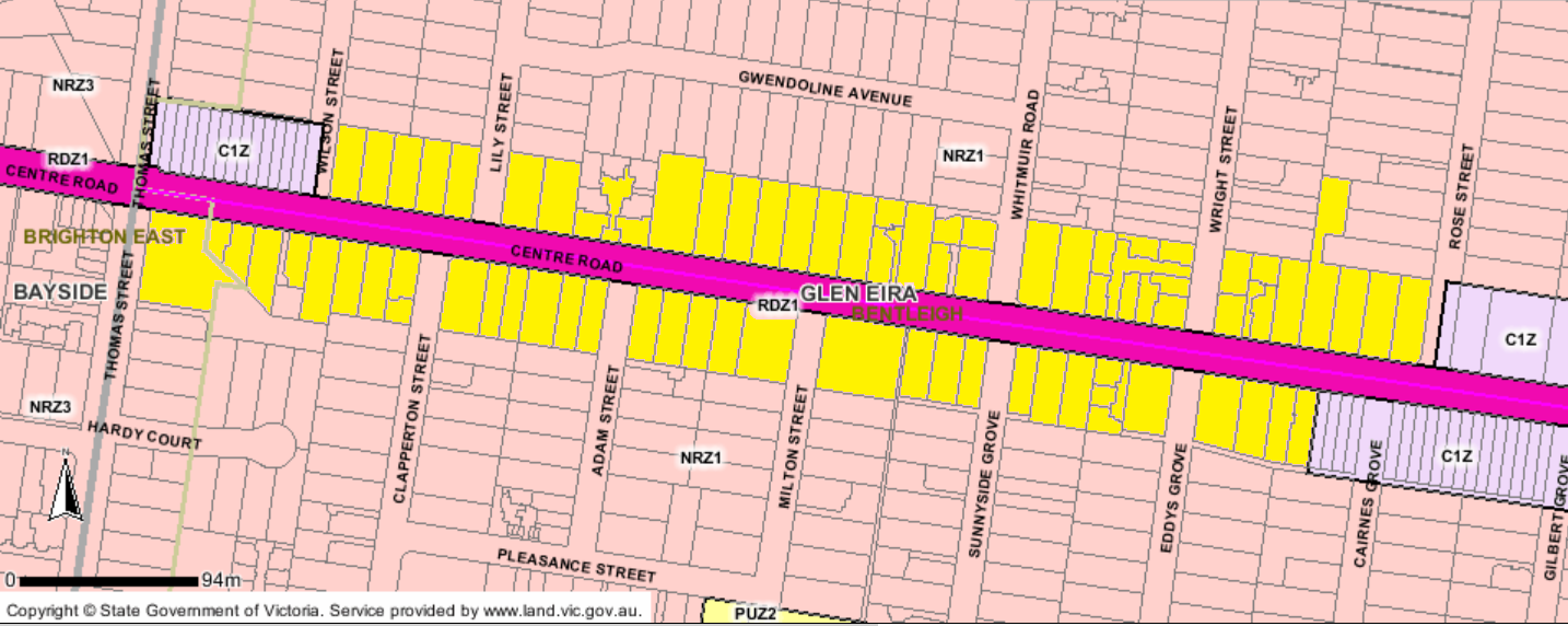 - Both sides of Centre Road running from Thomas St to Jasper Road will now be available for at least 3 storey buildings. (coloured light green in the above map). These properties are currently zoned Neighbourhood Residential. The sites marked yellow on the following planning map show what is about to happen to this zoning and how many properties are impacted in just this strip of road.