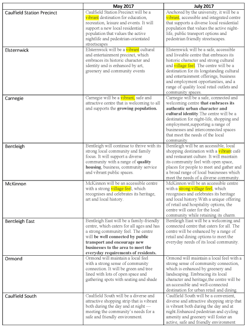 Throughout the first stage of ‘consultation’ on council’s structure planning residents made it absolutely clear that vision statements which included terminology such as ‘vibrant’ and ‘village feel’ were way off the mark and totally inappropriate for neighbourhoods that had already been ruined by over development. Thus it is important to compare the May version of council’s plans with the current July version and to see exactly how much has changed and to what extent council has listened to its residents.
