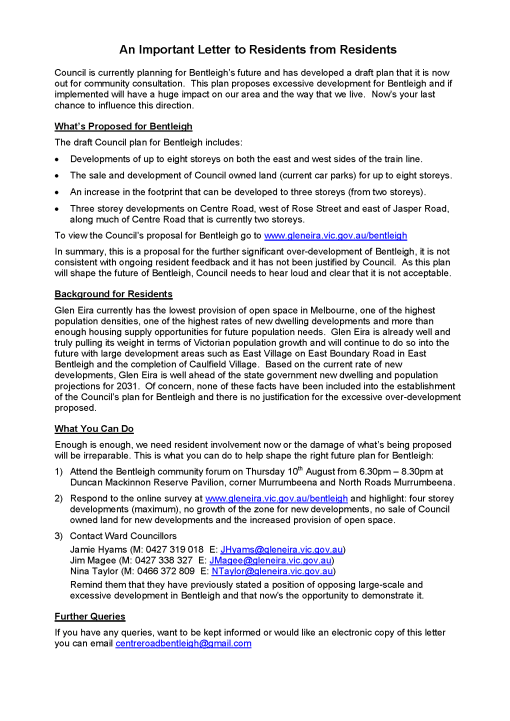 Well done people. Terrific letter. How about reproducing this for Carnegie, Ormond, Elsternwick, Bentleigh East, McKinnon, Murrumbeena and the rest. Enough is enough.