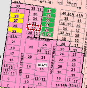 Thus 50% of this small side of the street is already 4 storeys and 60 units! But it gets worse. The East side of Bent St is currently zoned for 3 storey (ie grz2). This is now extended to 6 properties further east along Vickery street which is currently zoned for 2 storeys.