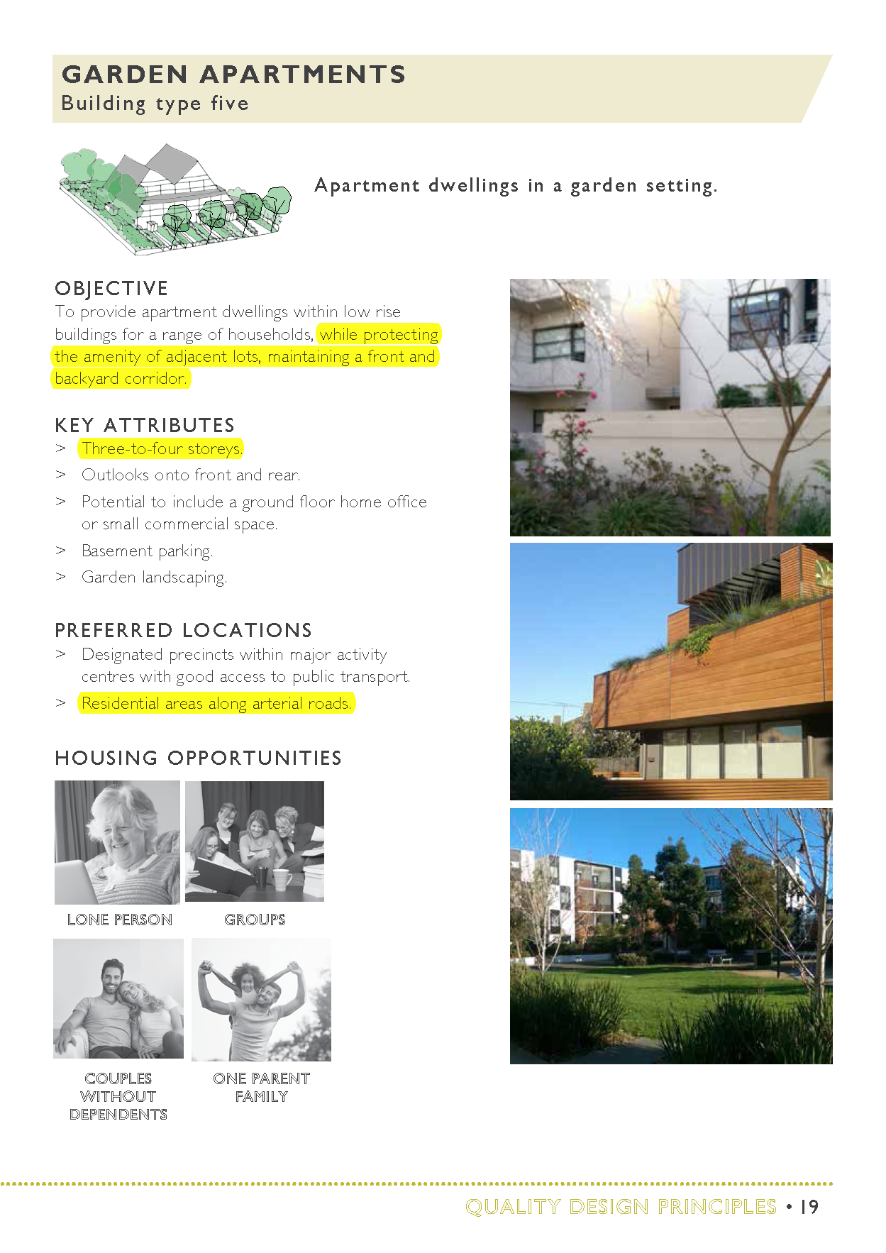 The Garden apartment (three to four storeys) building type seeks to ensure that apartments located within these residential streets look and feel residential with a strongly vegetated garden setting, and a recognizably residential building form.