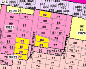 The light green changes are then included, we presume, in the calculation of council’s magnanimous reduction of 10 hectares worth of properties. If only it were so! The image below shows the current situation in Mitchell and Robert Streets. The yellow infill represents 4 storey developments already being built or with permits grants. The total land area these developments occupy is 0.89 hectares. We have not bothered to calculate other areas of Bentleigh. We simply highlight the fact that once again council’s figures need to be taken with a huge grain of salt!