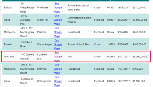 The above image details recent government sales. In this instance, we highlight crown land that has been zoned under ‘education’. The site at 100 Queens Avenue is a single storey building (primarily computer labs) plus an adjacent car park that has been there for eons. Questions abound: