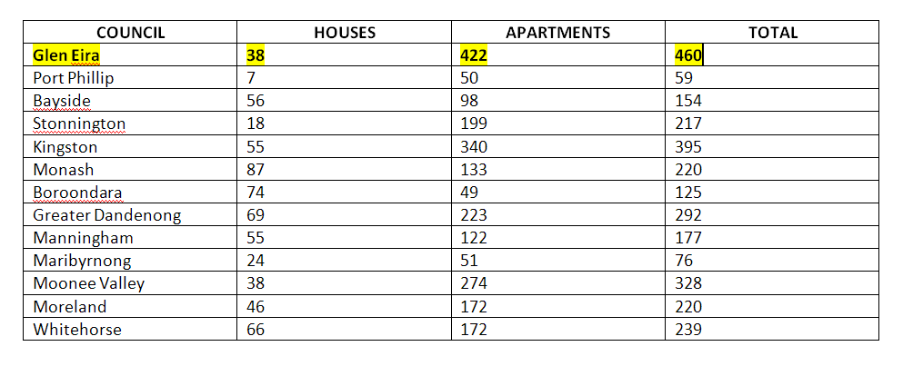 Please consider the table below. Glen Eira is now not only the biggest development municipality in the south east, but is winning hands down for the Northern suburbs alone. If the current rate continues, then Glen Eira will well and truly surpass another 2000 net new dwellings per year!