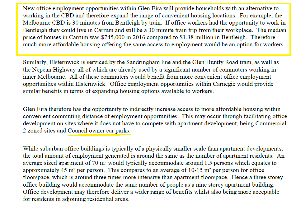 - The largest assumption of course is that companies will decide to rehouse to Glen Eira. In a March 2017 article written by the paper’s economic editor, the reverse was found to be the case – that companies are drawn to the CBD rather than the suburbs or regional centres. See: http://www.smh.com.au/victoria/melbourne-booms-while-the-rest-of-victoria-wilts-and-itll-only-get-worse-20170307-guslcg.html