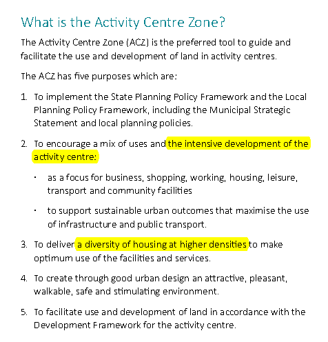 Activity centres have 5 main purposes as shown in the following screen dump from the State Government’s Practice Notes. Whilst this dates from 2015, not much has changed in the recent Plan Melbourne ‘Refresh’. Activity centres are there to facilitate further development – especially those centres which have train stations in their midst.